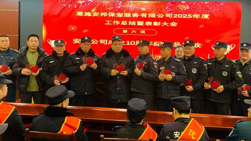 以十年为尺,丈量守护的深度;以晨光为证,镌刻责任的重量。恩施安邦保安服务有限公司迎来了“成立十载”与“年度收官”的双重庆典。2月6日上午9时20分,公司成立10周年暨2025年终总结表彰大会在安邦公司四楼会议室隆重启幕。恩施市公安局内保大队副大队长崔亚东、公司董事长杨昌军、总经理夏秋江、办公室主任易文凭与员工代表欢聚一堂,共同回望十年拼搏路,表彰先锋榜样,致敬忠诚老臣,共绘2026年安全发展新蓝图。